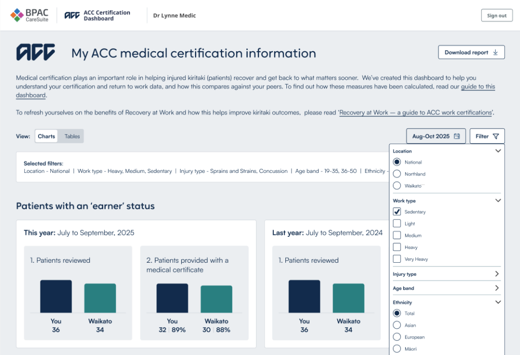 It provides detailed information on your medical certification practice, with measures for fully unfit certification, fit for selected work certification, and incapacity durations. You can also segment your data by injury type, work type, age group, and ethnicity, and compare against the same time last year and regional averages.