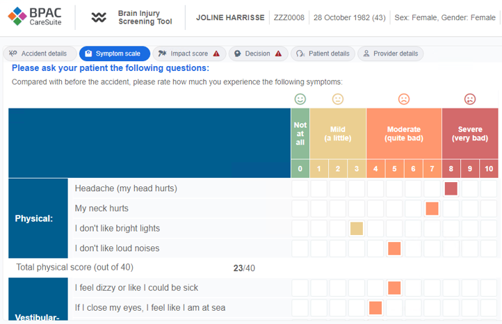 The Brain Injury Screening Tool (BIST) was developed by Auckland University of Technology as a brief, evidence-based tool for initial presentation after injury. It guides healthcare pathway decisions and monitors symptoms and recovery over time, operationalising current international best practice guidelines to support your clinical assessment conversations. Our digital version of this assessment makes it easy to complete and use.